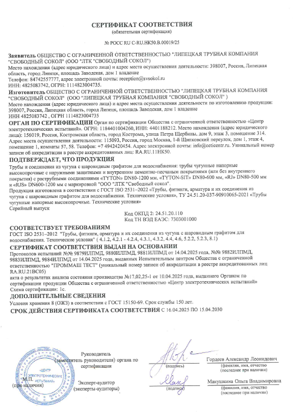 Сертификат на тип продукции. Продукция: Трубы чугунные напорные высокопрочные с наружными защитными и внутренним цементно-песчаным покрытиями (или без внутреннего покрытия) с раструбными соединениями «Tyton» DN80-1200 мм, «Tyton-Sit» DN80-600 мм, «RJ» DN80-500 мм из высокопрочного чугуна с маркировкой «ООО «ЛТК «Свободный сокол». | |